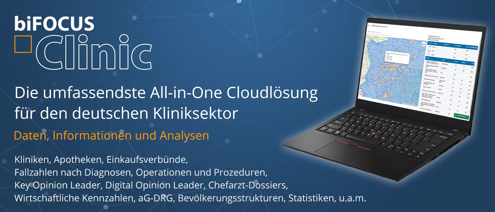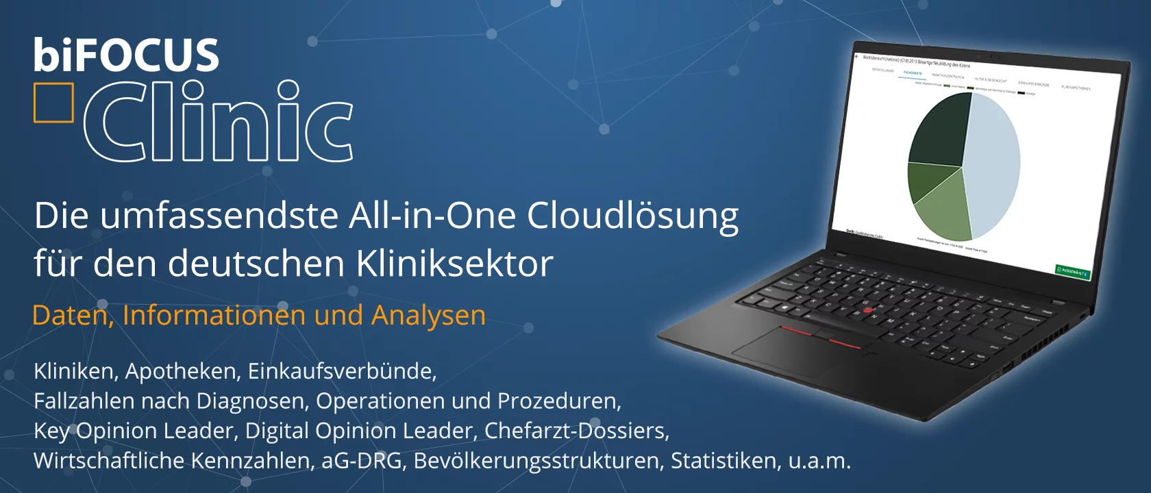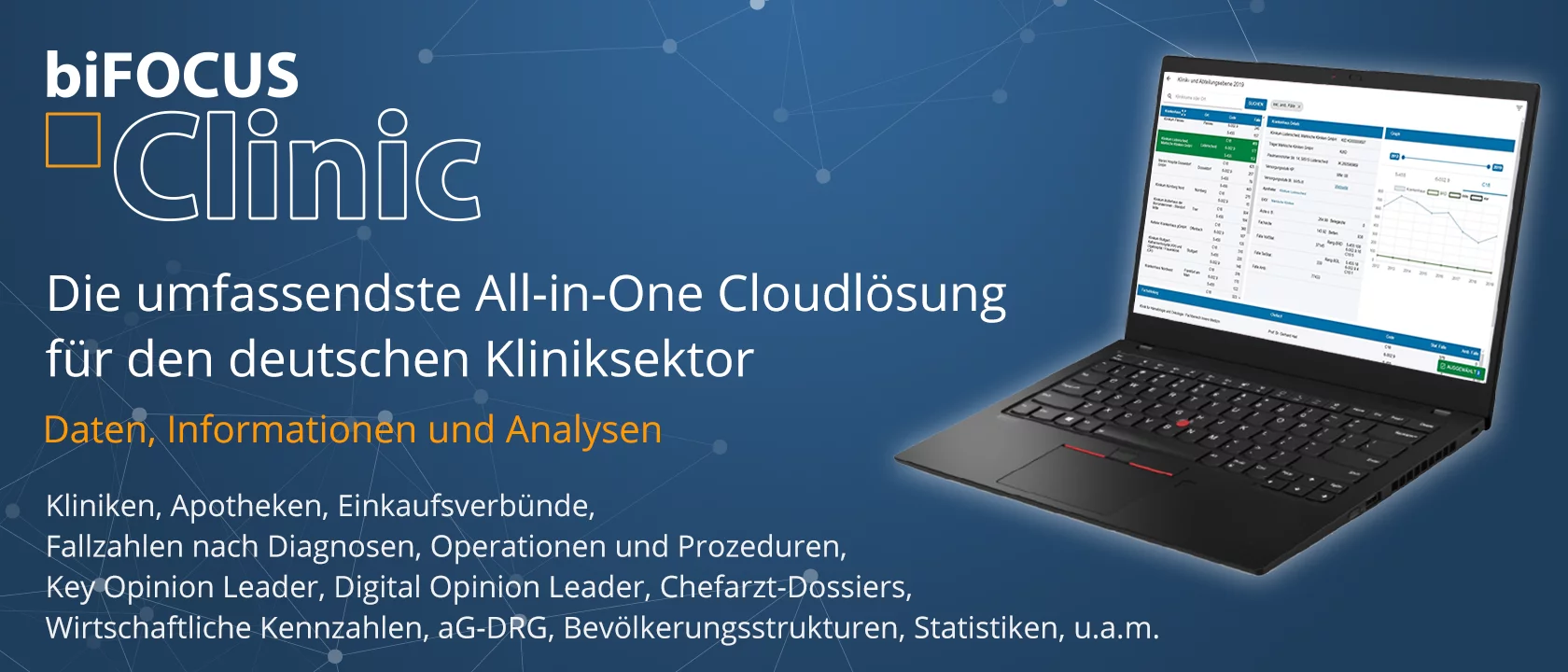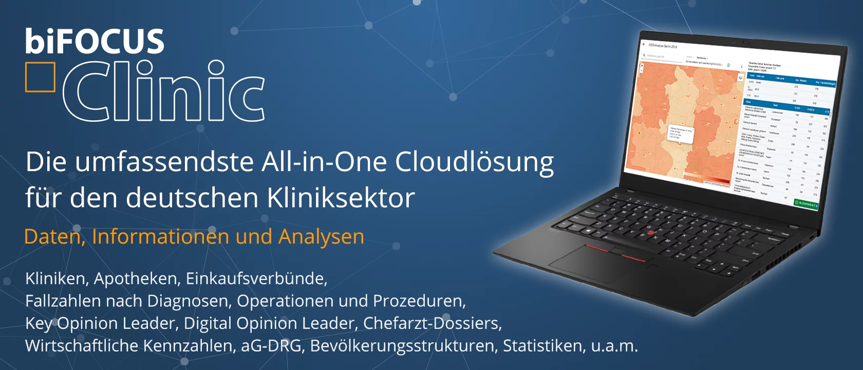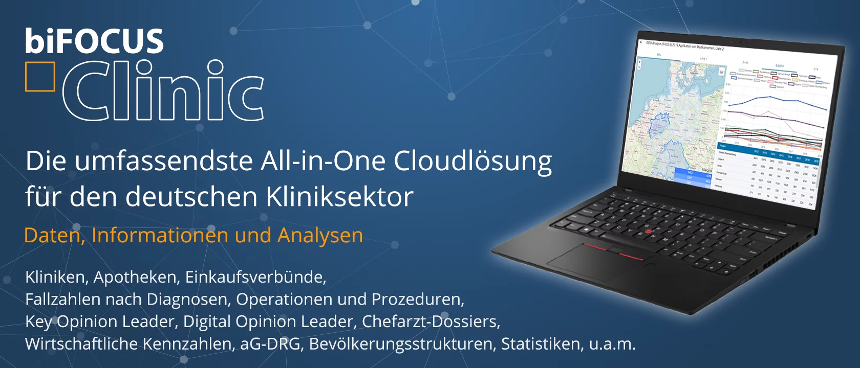 BI&I hat durch die Vernetzung von Informationen aus unterschiedlichsten öffentlich verfügbaren Quellen die umfassendste All-in-One Datenbanken als Cloudlösung für den Kliniksektor in Deutschland geschaffen. Die intuitive Oberfläche unserer Cloudlösung berücksichtigt die unterschiedlichen Perspektiven der Player (Krankenhäuser, Pharma- und Medizintechnikunternehmen, Beratungsunternehmen, Wissenschaft, Kostenträger und Politik) in diesem hochkomplexen Markt.