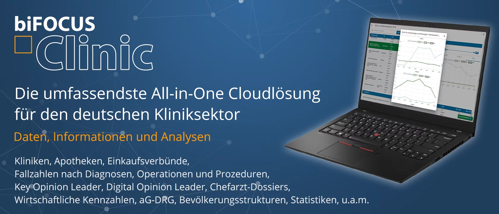 Fallzahlen nach Diagnosen, Operationen, Prozeduren pro Fachabteilung (stationär/ambulant), Personal, Material, Klinikausstattung, Unternehmenserfolg der Trägergesellschaften, Bevölkerungsstrukturen, Kostenstrukturen (aG-DRG) und vieles mehr.