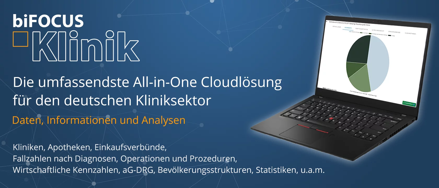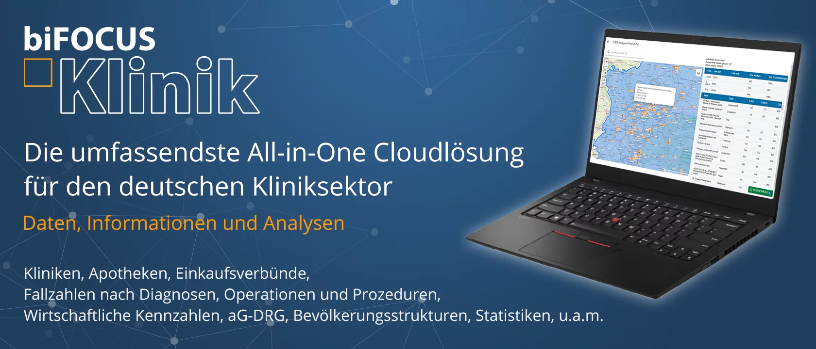 BI&I hat durch die Vernetzung von Informationen aus unterschiedlichsten öffentlich verfügbaren Quellen die umfassendste All-in-One Datenbanken als Cloudlösung für den Kliniksektor in Deutschland geschaffen. Die intuitive Oberfläche unserer Cloudlösung berücksichtigt die unterschiedlichen Perspektiven der Player (Krankenhäuser, Pharma- und Medizintechnikunternehmen, Beratungsunternehmen, Wissenschaft, Kostenträger und Politik) in diesem hochkomplexen Markt.
